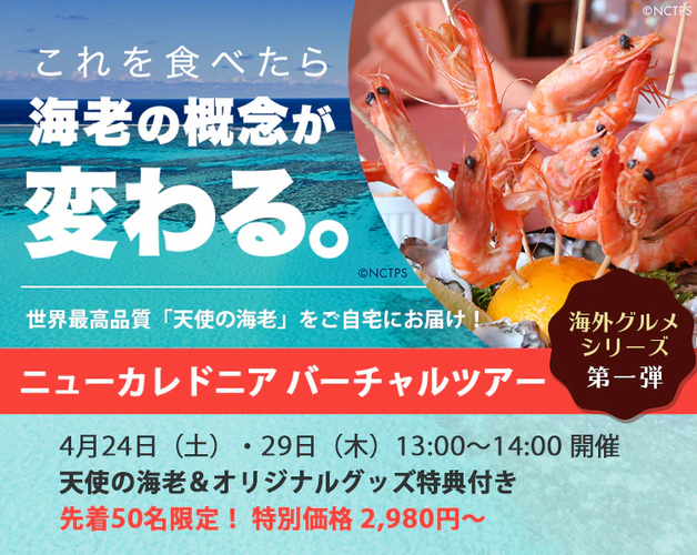 ニューカレドニアの「天使の海老」をお届けするプランです。海外グルメをお届けするだけでなく、バーチャルツアーでニューカレドニアの魅力をたっぷりご紹介!現地のスタッフと繋ぐので、気になることはその場で何でも聞けます!天使の海老のオススメの食べ方もご紹介します。
