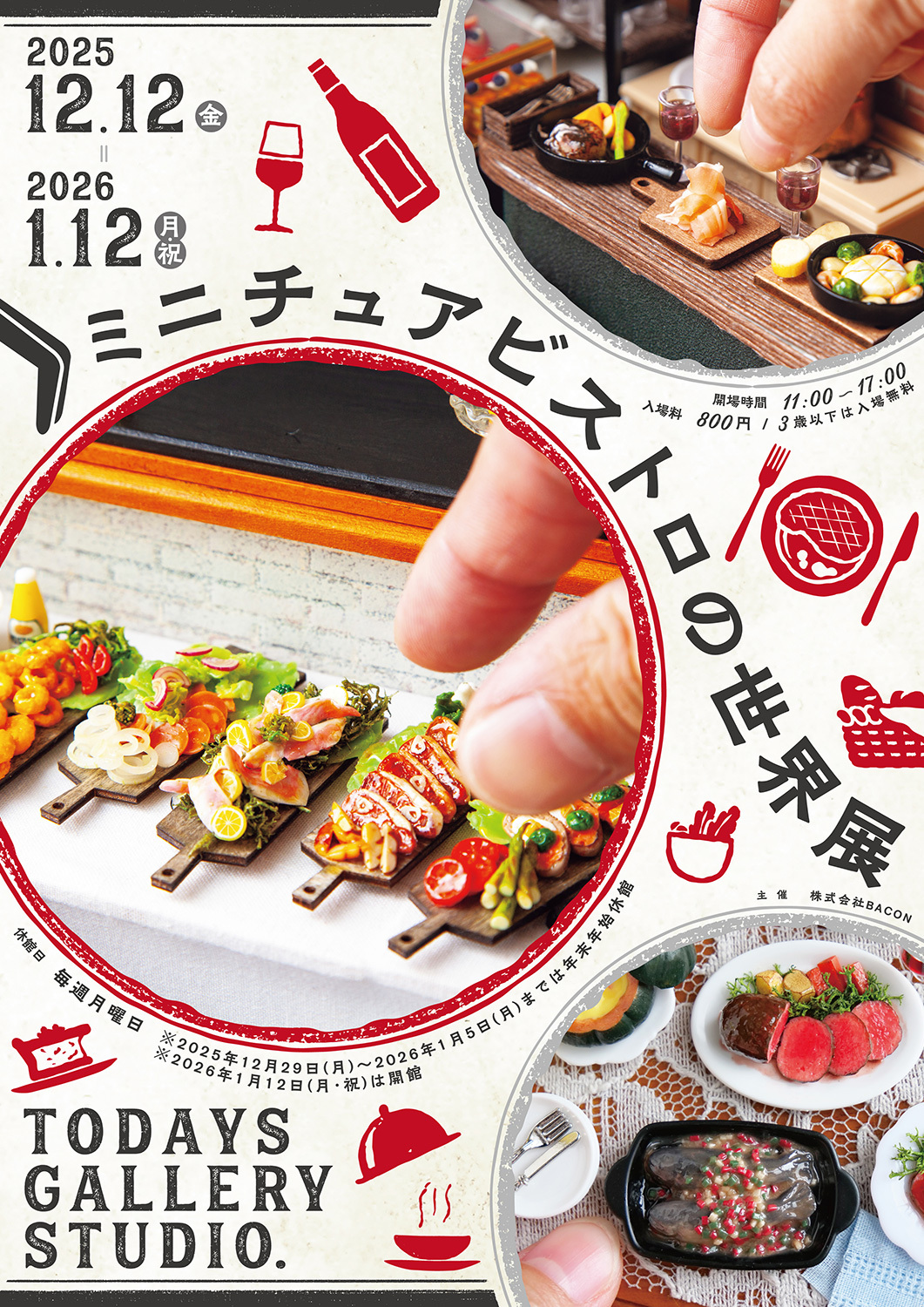株式会社BACON(べーこん)は、ギャラリー「TODAYS GALLERY STUDIO.」(東京・浅草橋)において、フランスの家庭料理やカフェ料理など“食”をテーマにした本格ミニチュア料理が一堂に会する合同作品展&物販展「ミニチュアビストロの世界展」を2025年12月12日(金)~2026年1月12日(月・祝)に開催します。本展は、東京での開催は初めて。まるで小さなビストロの厨房を覗き見るような臨場感の中で、“食べられない料理”が織りなす美味しいアートの世界が楽しめる、新感覚のミニチュア展です。