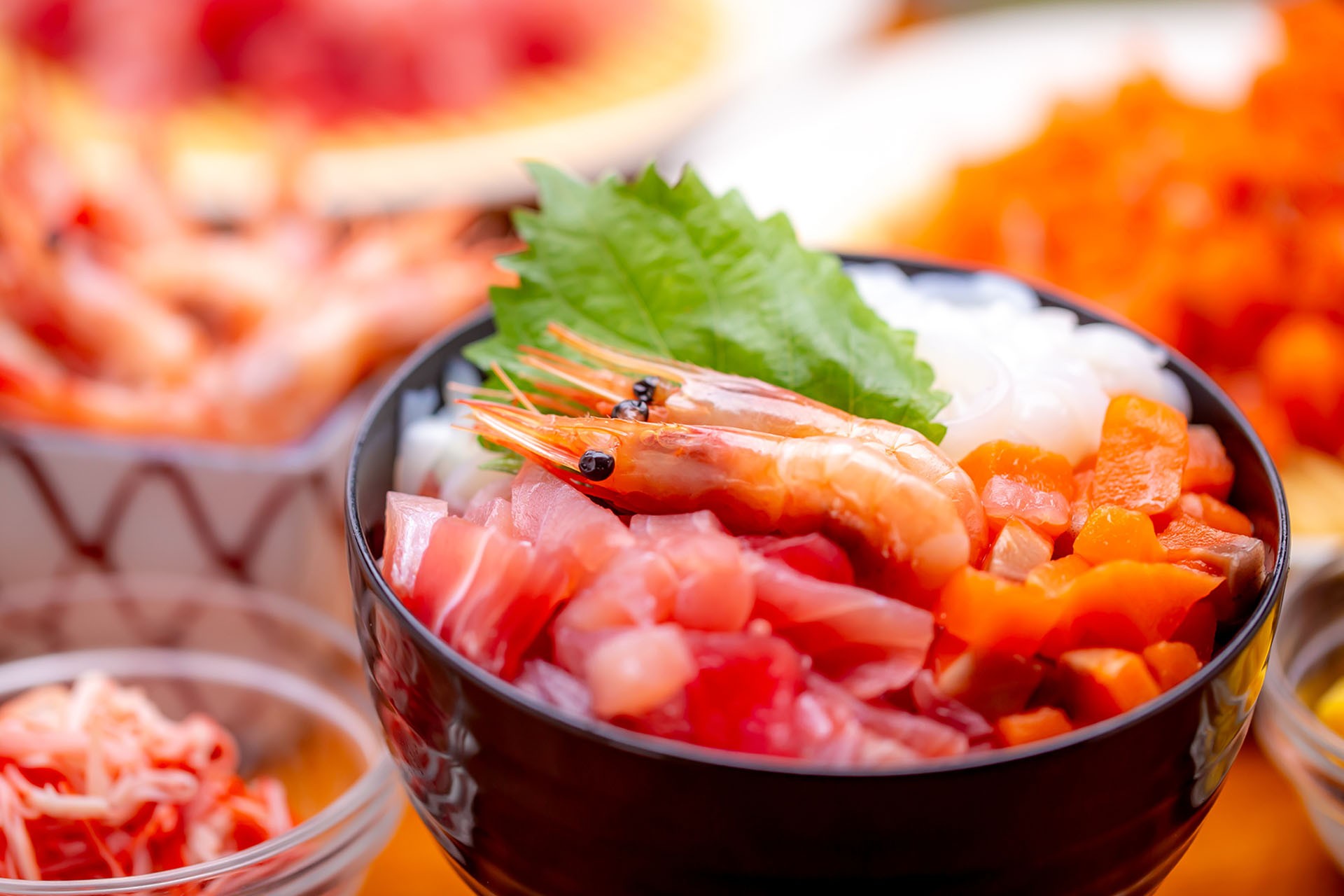 旬の地魚の刺身や、好きな具材をのせて作る「のっけ丼」をはじめ、ライブキッチンでは鉄板焼き、寿司、天ぷら、アジフライなど、出来たての料理をご提供。海鮮メニューを中心に、和・洋・中さまざまな料理が並ぶ、バラエティ豊かなバイキングです。ケーキやアイスなど約20種類のスイーツに加え、キッズメニューや離乳食も充実。ソフトドリンク15種類もすべて飲み放題で、お子様から大人まで幅広くお楽しみいただけます。