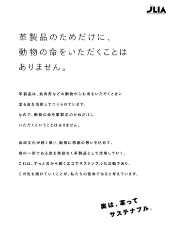 Thinking Leather Actionとは、皮革原材料~靴・バッグ・鞄・小物・ベルト・手袋・アパレルなどの革製品を取り扱う団体から成り立つ日本最大の総合団体である(一社)日本皮革産業連合会(JLIA)が主導する、皮革・革製品などのサステナビリティを発信していくプロジェクトです。革がなぜエコでサステナブルな素材なのかを正しい知識を基に理解を広める活動を行っています。