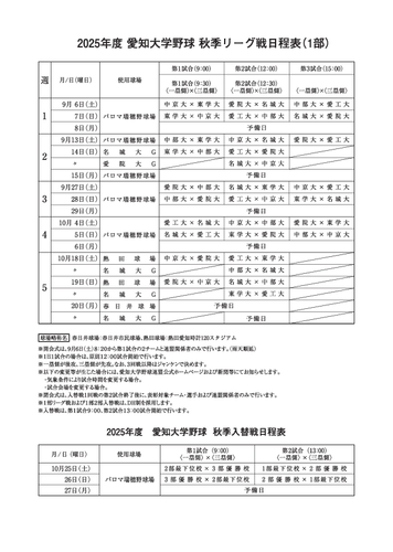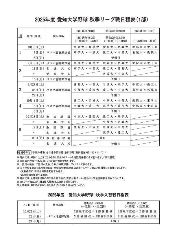 ※秋季リーグ戦の上位2校は11月1日からパロマ瑞穂野球場で行われる「東海地区・北陸・愛知三連盟王座決定戦」に出場し、優勝校は11月下旬に神宮球場で開催される「明治神宮野球大会」に出場します。