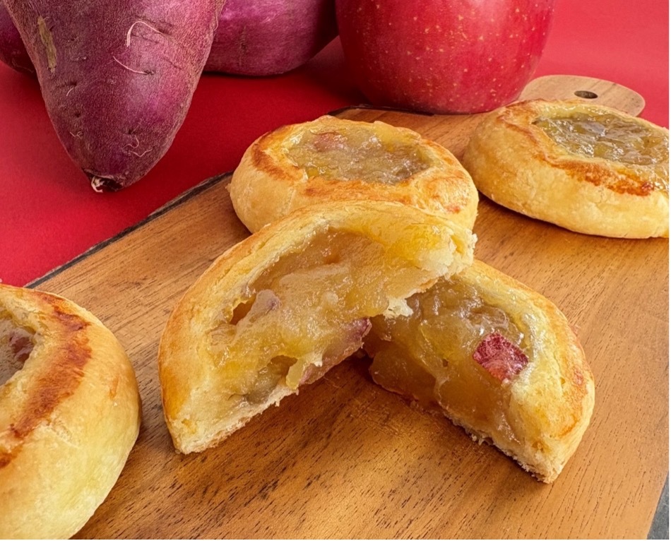 サクッと香ばしいパイの中に、シャキッとした食感のリンゴと、濃厚な味わいのお芋を合わせて焼き上げました。冬の季節にぴったりの、温かみのある味わいです。お正月のお茶請けやおやつとしても、幅広い年代の方にお楽しみいただけます。