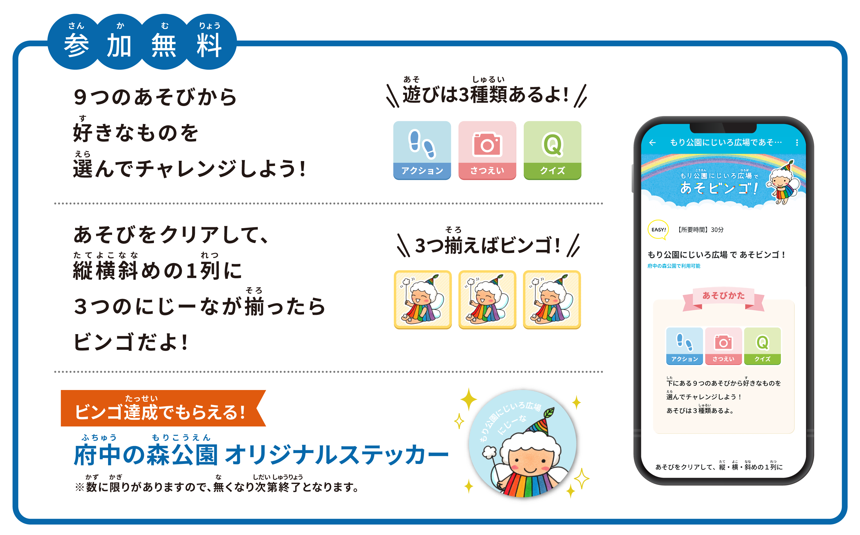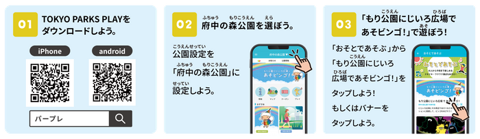 【2/1(木)配信スタート】東京都公園協会公式アプリ「TOKYO PARKS PLAY」で、遊びながら公園を知ることができるビンゴ形式コンテンツ『府中の森公園~もり公園にじいろ広場であそビンゴ!~』をリリース!!