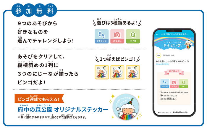 『だれでも、みんなで遊べる』府中の森公園の遊具広場(もり公園にじいろ広場)では、ビンゴ形式のコンテンツを2024年2月1日(木)にリリースします。