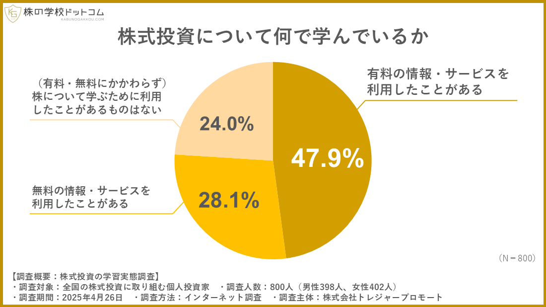 オンライン株式スクール「株の学校ドットコム」(運営会社:株式会社トレジャープロモート、東京都千代田区、代表取締役社長:瀬川 丈)では、株式投資に取り組む全国の個人投資家800人を対象に、学習に関するアンケート調査を実施しました。