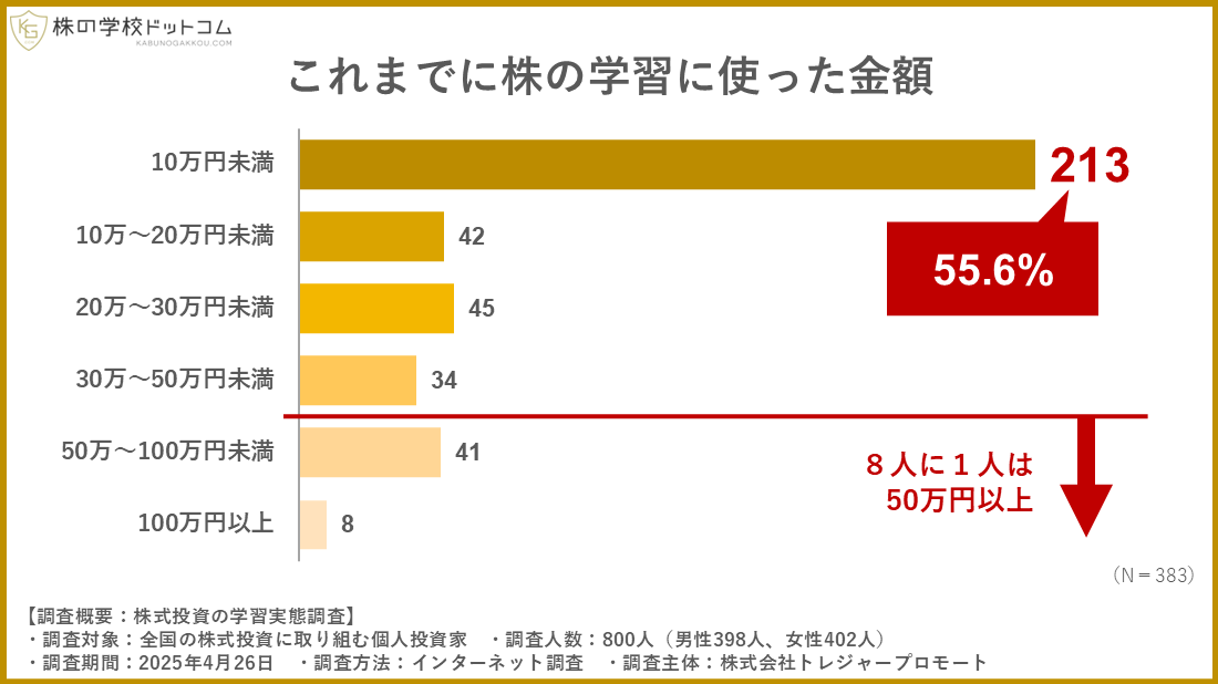 有料の情報・サービスを活用して株式投資について学んでいる人は、どれくらいの金額を使っているのか? 383人に訊ねたところ「10万円未満」と回答した人が圧倒的に多く、55.6%(213人)にのぼりました。8人に1人は50万円以上使っており、100万円以上のお金を使っている人も2.1%(8人)いました。
