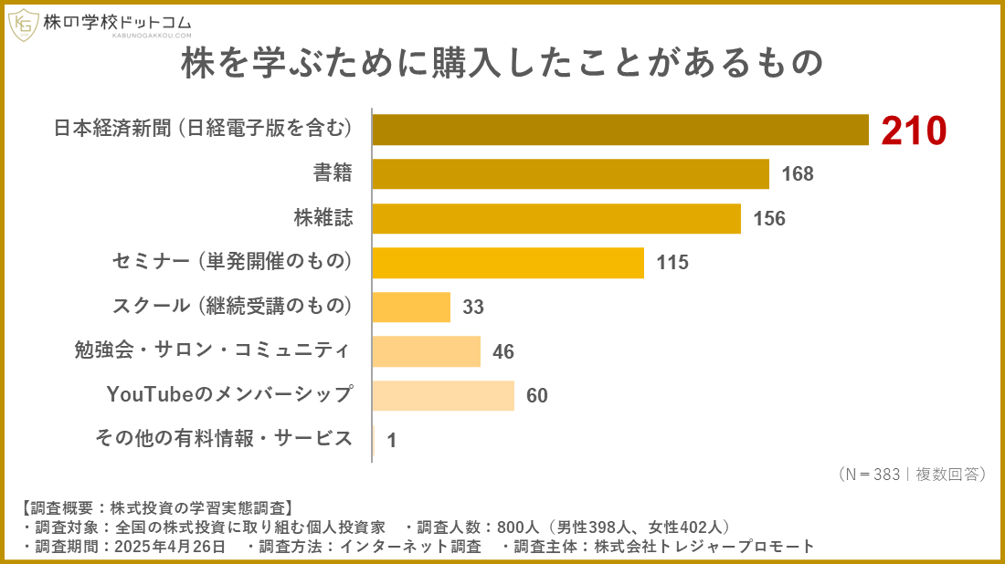 具体的にどんなものを利用しているのでしょうか。有料の情報・サービスを利用したことがあると回答した383人によると、購入したことがあるもので最も多かったのは「日本経済新聞」で、半数を超える54.8%(210人)が株式投資について学ぶために日経新聞を読んだことがあると回答しました。