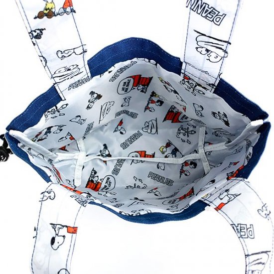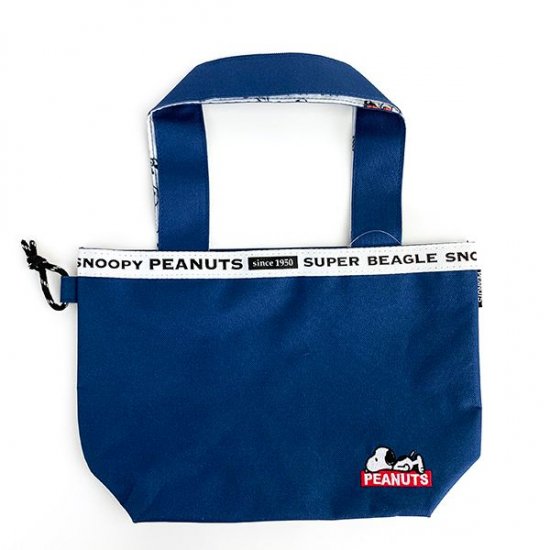 ネイビーの本体に、寝そべりポーズのスヌーピーの刺繍がワンポイントでデザインされたトートバッグです。