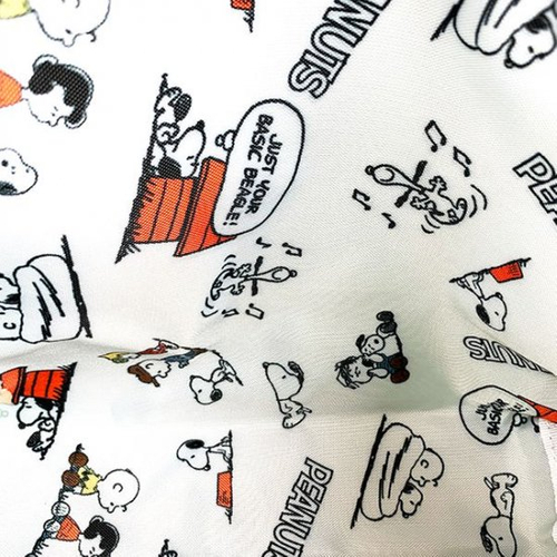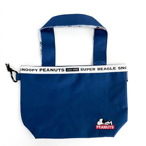 スヌーピーの寝そべりポーズがワンポイントになった、ミニトートバッグをご覧いただきます。表面はシンプルですが、内側はフレンズも登場するデザイン。適度なサイズ感も汎用性があって大人気です。