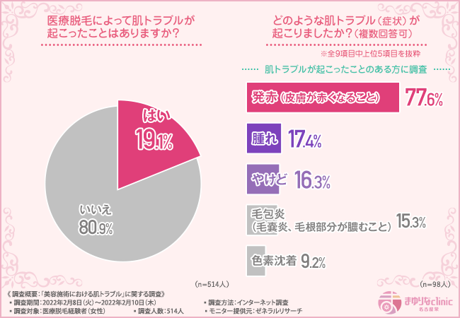 医療脱毛を受けた2割近くの方は肌トラブルが起きていることが判明しました。