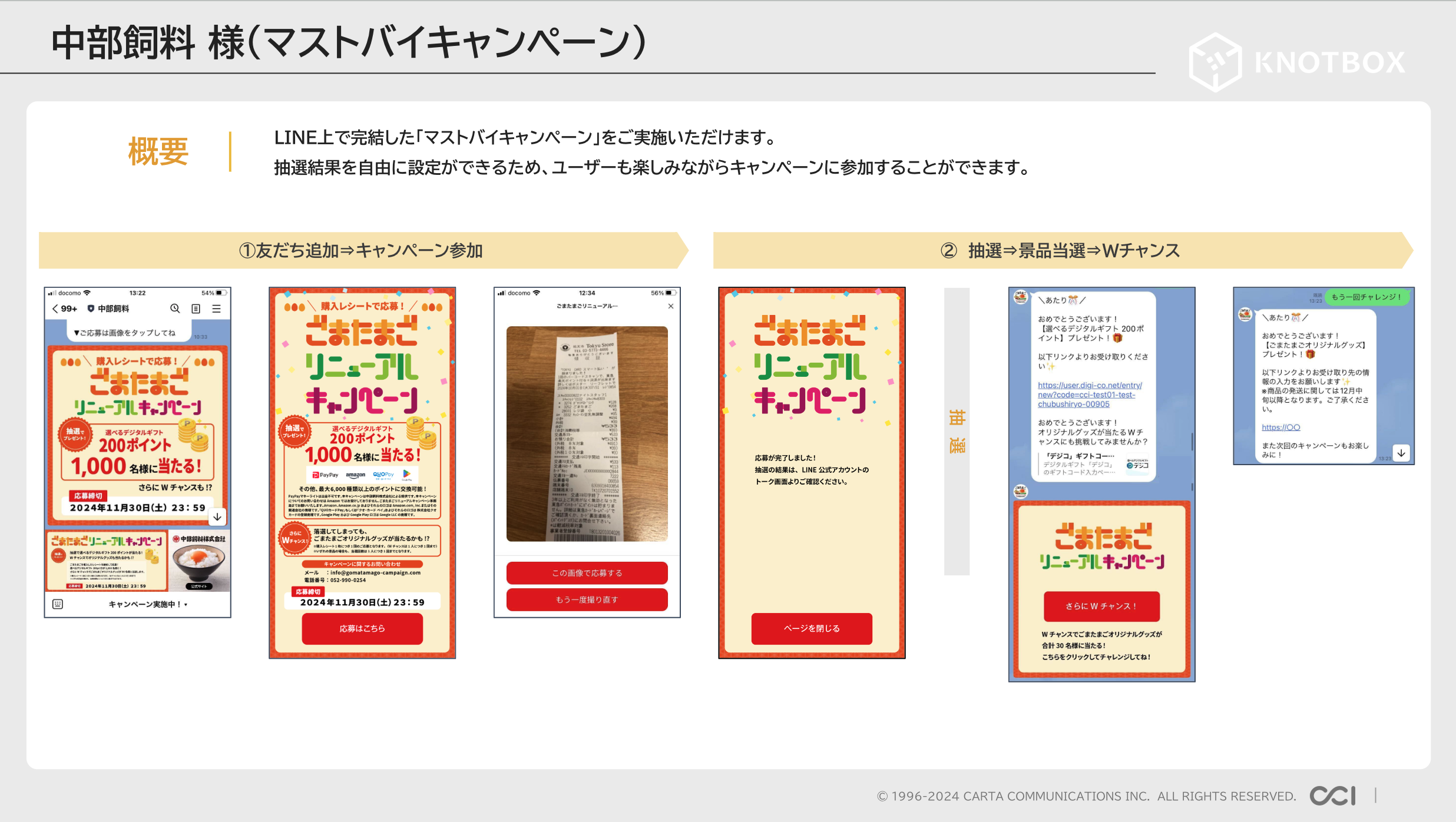 株式会社CARTA HOLDINGSのグループ会社である株式会社CARTA COMMUNICATIONS(東京都港区、代表取締役社長:目黒 拓、以下「CCI」)が提供するLINEを活用したマーケティング支援プラットフォームツール「KNOTBOX(ノットボックス)」(https://www.knotbox.cci.co.jp/)は、同じくグループ会社である株式会社DIGITALIO(東京都港区、代表取締役CEO:古谷 和幸、代表取締役COO:安藤 敦士、以下「DIGITALIO」)が運営するデジタルギフト「デジコ」(https://digi-co.net/)と連携し、中部飼料株式会社(愛知県名古屋市、代表取締役社長:平野 晴信、以下「中部飼料」)への「マストバイキャンペーン」施策を実施いたしました。
