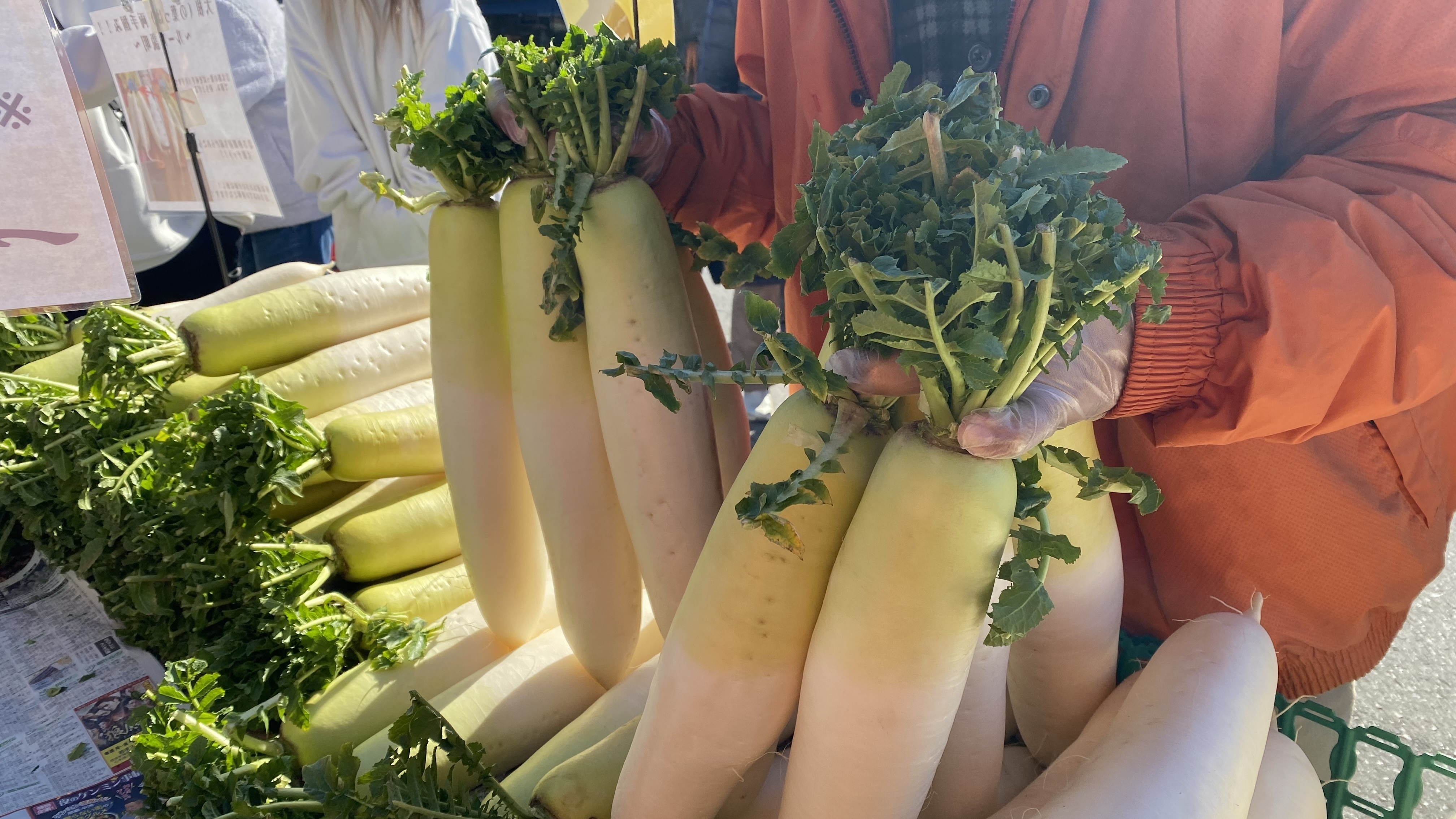 両手で5秒間、葉っぱを掴み持ち上げた本数分だけ大根をお持ち帰りいただけます。腕力勝負の大人気イベント!