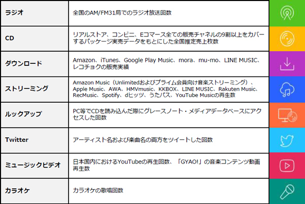 全国推定売上枚数、ダウンロード回数、ラジオ放送回数、ルックアップ数、ツイート数、ストリーミング数、YouTubeおよびGYAO!の動画再生回数、カラオケ歌唱回数を元にした独自ポイントを合算した、米国でもBillboard音楽チャートの中心となるチャート