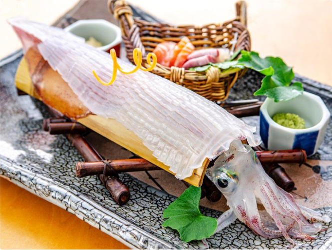 一方、活け〆白イカは、静かな海に灯りがともり、水平線に浮かぶイカ釣り漁船の幻想的な風景とともに味わえる旬の味覚です。近海で水揚げされてすぐに船上で迅速に活け〆されるため、その鮮度と旨味は抜群。
