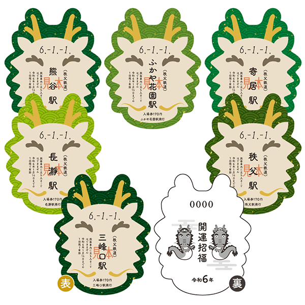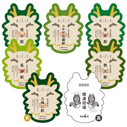 秩父鉄道株式会社(本社:埼玉県熊谷市、代表取締役社長:牧野 英伸)は、2024年干支の『辰』をモチーフにした開運記念入場券を2024年1月1日(月・祝)から1月14日(日)の期間、数量限定で販売いたします。また、2024年1月1日(月・祝)から1月8日(月・祝)の期間、通勤用車両7500系1編成(フルラッピングトレイン:秩父三社トレイン)および7800系1編成の先頭に開運特別ヘッドマークを掲出して運行いたします。詳細は、下記のとおりです。