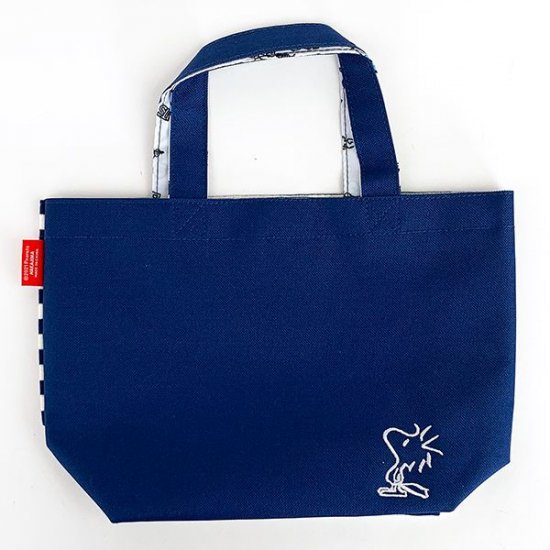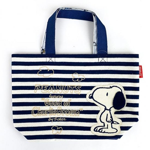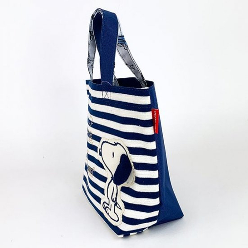 ネイビー×アイボリーのボーダーがオシャレな、スヌーピーのトートバッグです。横向きのスヌーピーがアップリケになっていて、耳が立体的になったキュートなデザイン♪