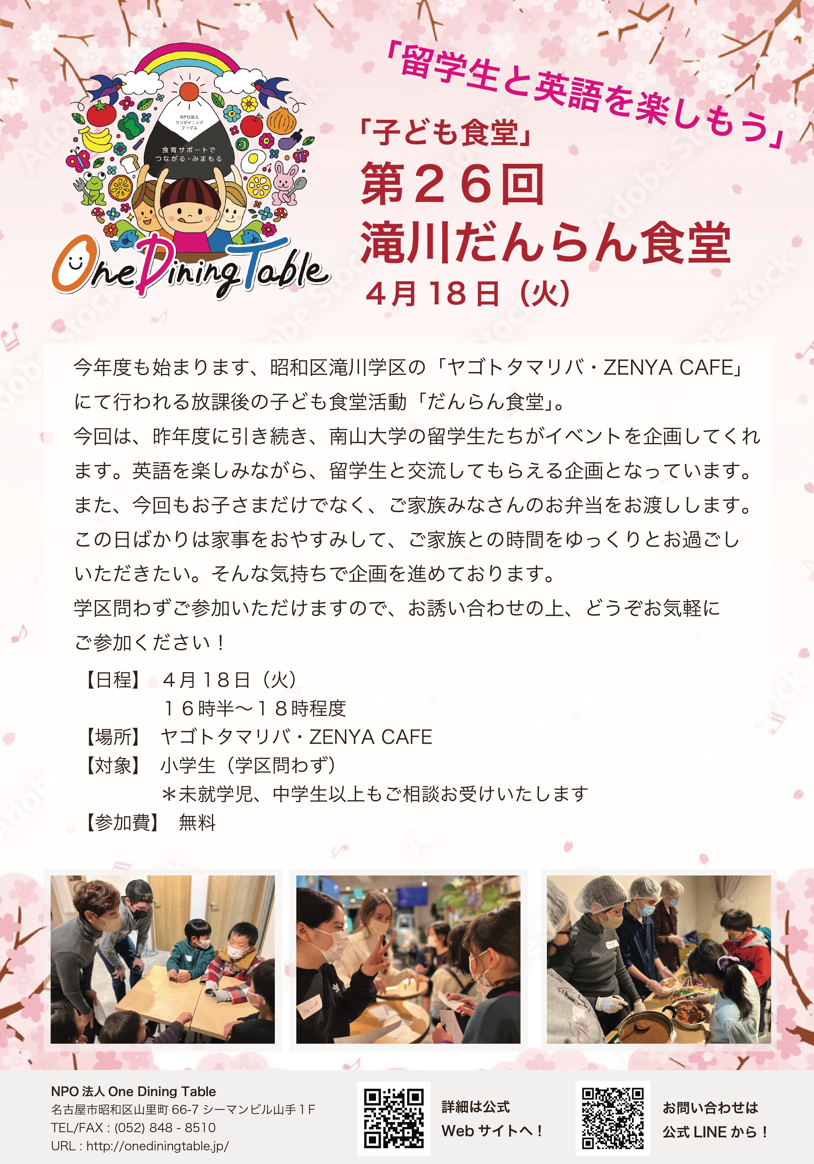 NPO法人One Dining Table(愛知県名古屋市)は2023年4月18日(火)に子ども食堂活動「第26回滝川だんらん食堂」を名古屋市昭和区にある「ヤゴトタマリバ・ZENYA CAFE」にて開催します。
