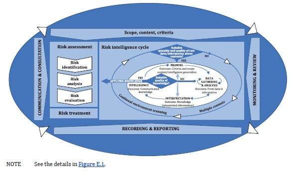 リスクアセスメントの中核にあるのが リスク・インテリジェンス・サイクル(risk intelligence cycle) の考え方です。ポイントは「単発の洗い出し」ではなく、組織横断で学習し続ける循環をつくることにあります。とくにAnnex Eでは、内部サイクルとして、次の4段階を明確にしています。