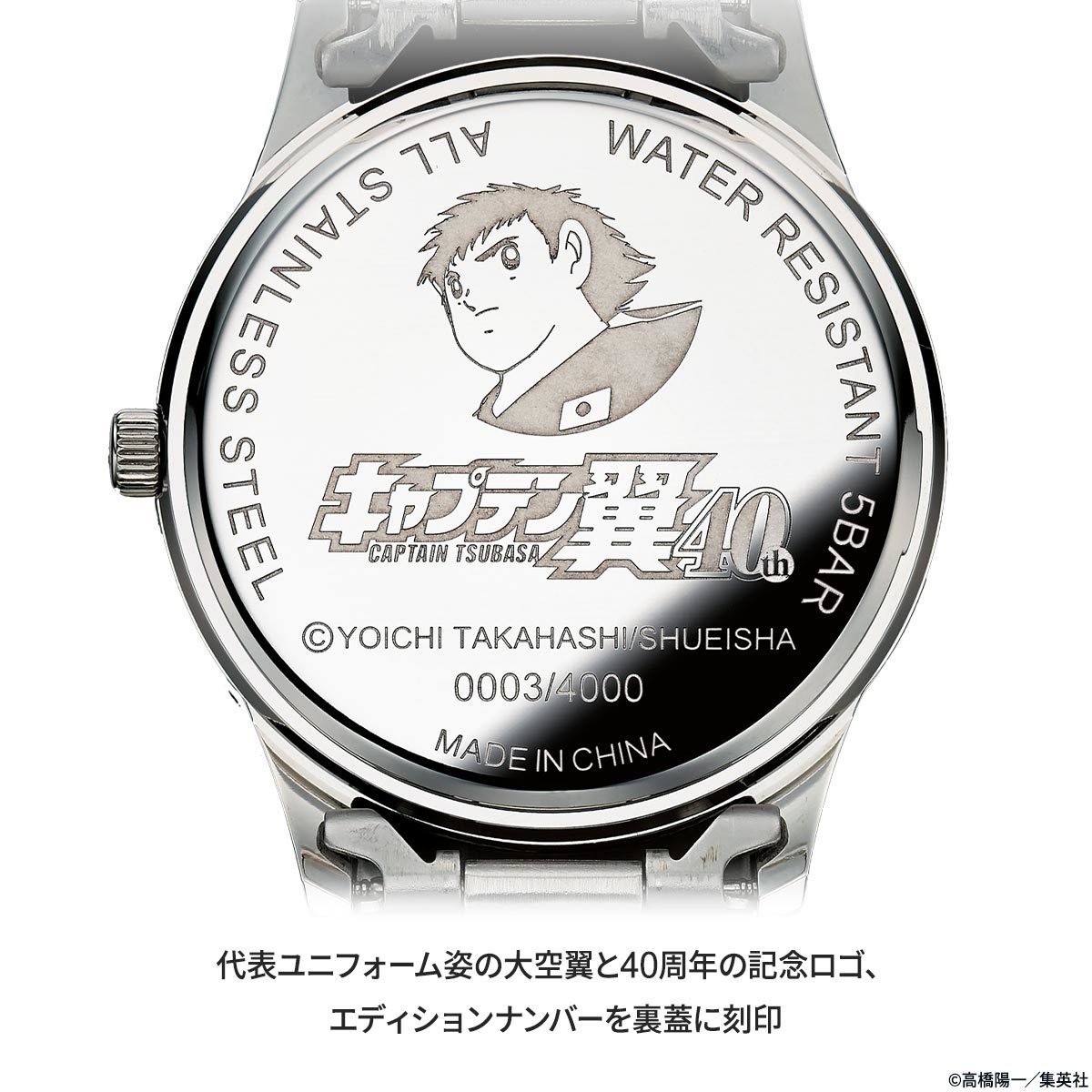 裏蓋には、代表ユニフォーム姿の大空翼と40周年記念ロゴ、限定の証であるエディションナンバーが刻印されます。