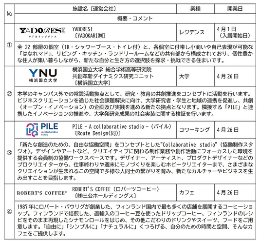 また、4月26日(水)には新たに3つの施設が登場。神奈川初出店となる北欧カフェ「ROBERT’S COFFEE(ロバーツコーヒー)」、クリエイター向け協働制作スタジオ「PILE(パイル)」、横浜国立大学のサテライト施設がオープンします。これらの施設は、クリエイティブな活動に取り組む人々の環境を支援する場所であるとともに、地域の方々や自治体および事業者とつながる場所として、取り組みの加速・拡大を支援します。