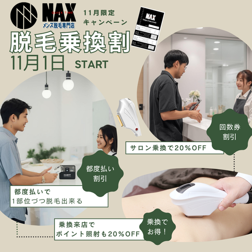 『他店からNAXに乗換』のお客様は回数券や都度払いがお求めやすくなりますので11月のキャンペーンをご利用し脱毛をご体験ください!