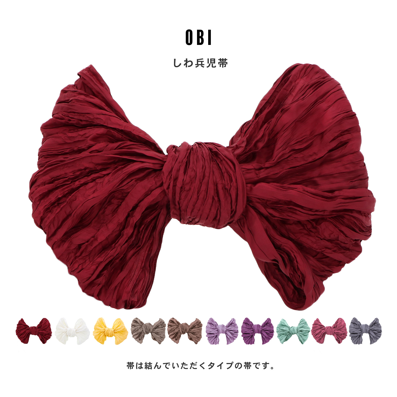 コーディネートに使用した帯は、ふわふわくしゅっとしたシワ加工がかわいい兵児帯です。しわ加工の施された、シャリ感のあるやわらかい生地で、柔らかく幅が広いので、ボリューム感のあるリボン結びが簡単にできます。