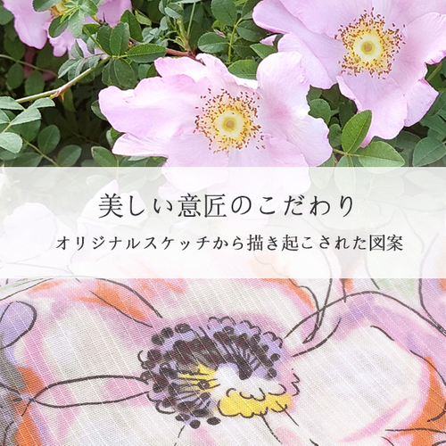 花や風景などの自然をモチーフにし、明るく華やかな柄やカラフルな色遣いと、自然の美しさを感じさせるデザインが特徴です。纏う人の魅力を引き立てる、明るく清らかな透明感を表現します。