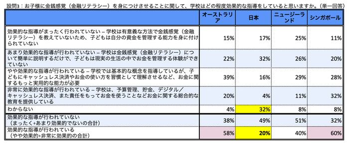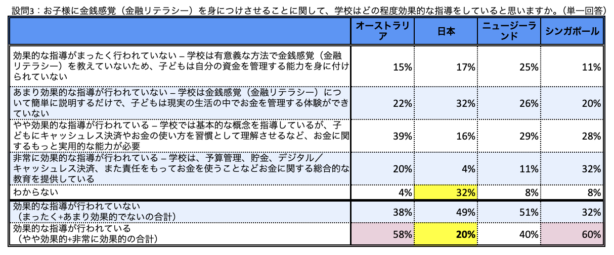 学校の金融教育が「効果的」(「非常に効果的」と「やや効果的」の合計)だと感じている日本の親はわずか20%で、全対象国の中で最も低く、シンガポール(60%)やオーストラリア(58%)と大きな差がありました。さらに、「わからない」と回答した親は32%にのぼり、こちらも全対象国の中で突出して高い結果となりました。