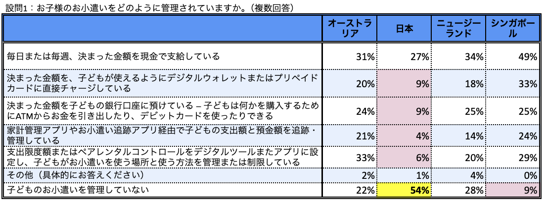 日本の親の過半数(54%)が子どものお小遣いを「管理していない」と回答し、調査対象国の中で突出して高い結果となりました。この割合はシンガポール(9%)の6倍にのぼりました。