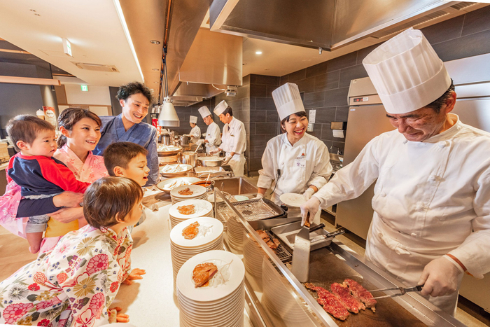 そのため、大江戸温泉物語グループのほぼすべてのホテル・宿にライブキッチンを設けています。目の前で調理、提供をするライブキッチンは見ているだけでわくわくし、また、出来たてを楽しめます。