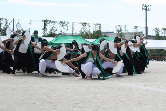 見どころは、生徒主体で盛り上がる「応援合戦」です。高校3年生をリーダーに、3学年縦割りで結成された4つの応援団(緑・青・赤・黄色)が一丸となって、準備や練習に取り組み、創造性と団結力に富んだ応援を披露します。また、伝統の近大福岡体操や、福岡の民謡「黒田節」を題材にした、よさこい祭りで披露される演舞楽曲の一つである「よさこい黒田武士」は必見です。