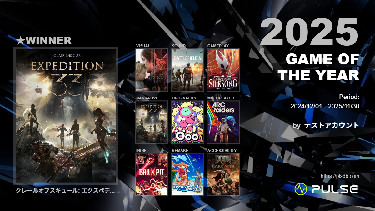 * **プロジェクト名:** 日本独自の評価基盤を作る - ゲーム記録・管理プラットフォーム「PULSE」