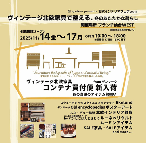 北欧インテリア&家具のセレクトショップ「apetera アペテラ」が、2025/11/14~17の4日間限定、ブランチ仙台(仙台市長命ケ丘2-21-1)で開催する家具・インテリアのショッピングイベント。