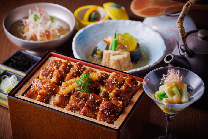◆田里津庵の「あなごひつまぶし」は、料理長厳選の三陸産天然あなごの真ん中の肉厚な部位のみを使用し、ふっくらと酒蒸しし、じっくりと焼き上げ香ばしく。