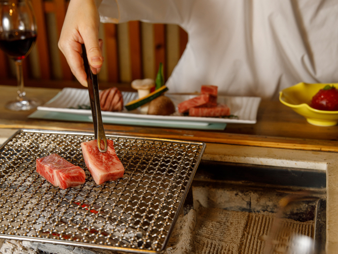 ◆コースのお食事では、仙台味噌焼きおにぎりを炭火の網の上に置いて、大葉に少し焦げ目がついたら、お好みで仙台牛しぐれ煮とわさびを添え、お出汁をかけてお召し上がりください