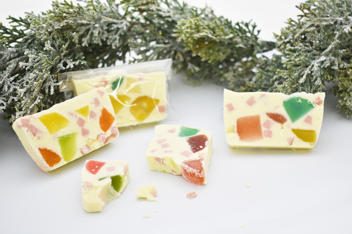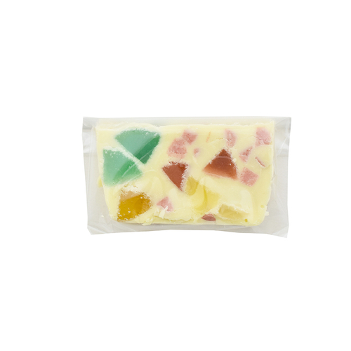 ホワイトチョコレートにいちごチョコレートや様々なフレーバーのバブレッツを入れ込みました。キラキラと輝くバブレッツ入りのチョコレートはプレゼントにもぴったりです。