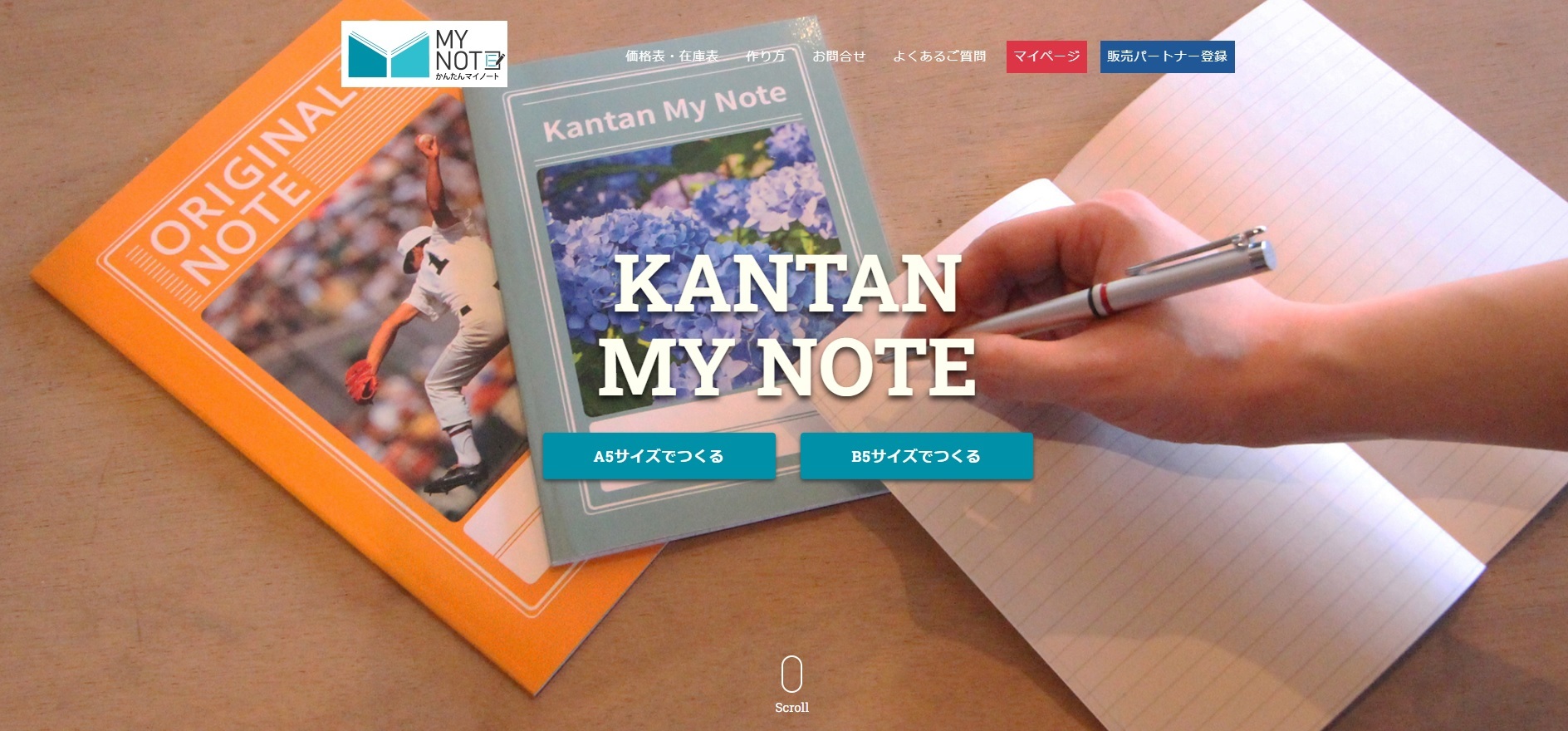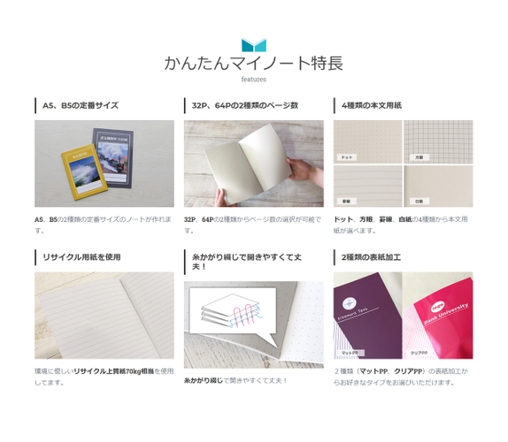 スマホやPCで専用の編集画面から好きな写真や画像、文字を挿入し、自分好みのノートを1冊から作成できるサービスです。表紙はフルカラーでノートの本文は、「方眼」、「罫線」、「ドット」、「白紙」の4種を用意。自分だけの1冊や、部活やサークルのオリジナルノート、イベントや企業のノベルティにも最適です。