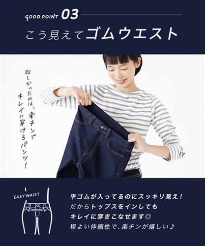 下半身をキレイに見せたいけれど楽チンさも妥協できない方や、今まで下半身のお悩みからスキニーを穿くことが叶わなかった方、脚をきれいに見せたいけれどガードルなどの補正下着は苦しいし穿くのが面倒という方など、大人女子のワガママを叶えるヒップアップデニム スキニーパンツでより一層オシャレをお楽しみください。