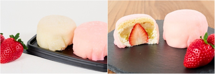 白の「お芋クリーム大福」と紅の「苺のクリーム大福」を組み合わせた、紅白の2個セット。