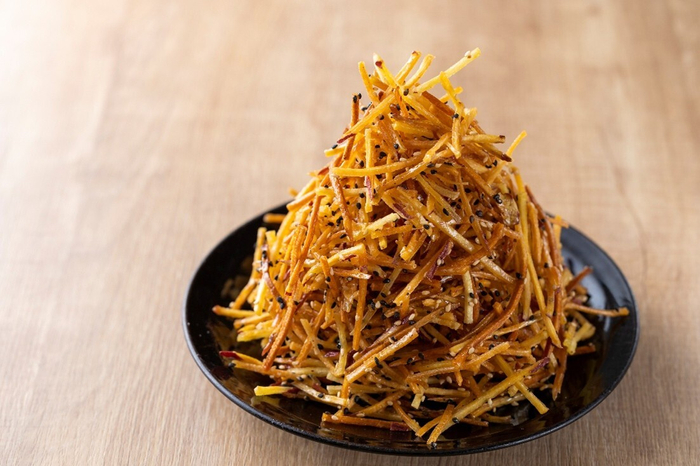 3mmカットのさつまいもを香ばしく揚げて黄金蜜を絡めた、パリポリ食感がたまらない極細の芋けんぴ。