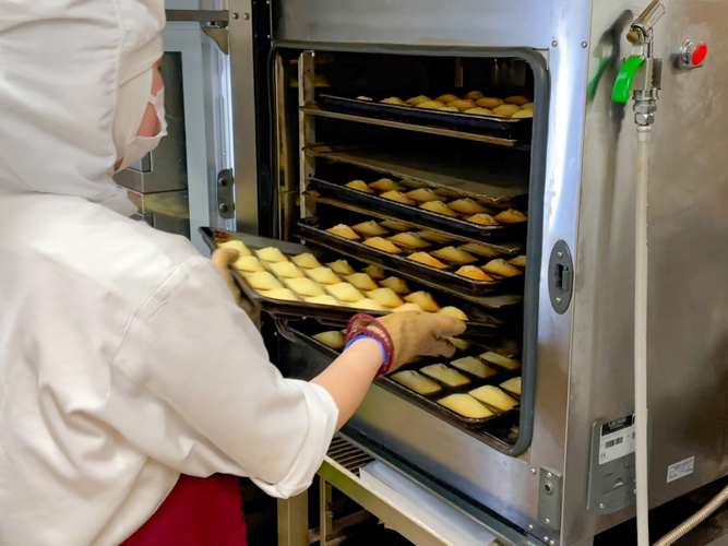 「はちみつフィナンシェ」は、熱伝導に優れる金属製の焼き型を使用し、熱風をファンで循環させて加熱するコンベクションオーブンで焼成。