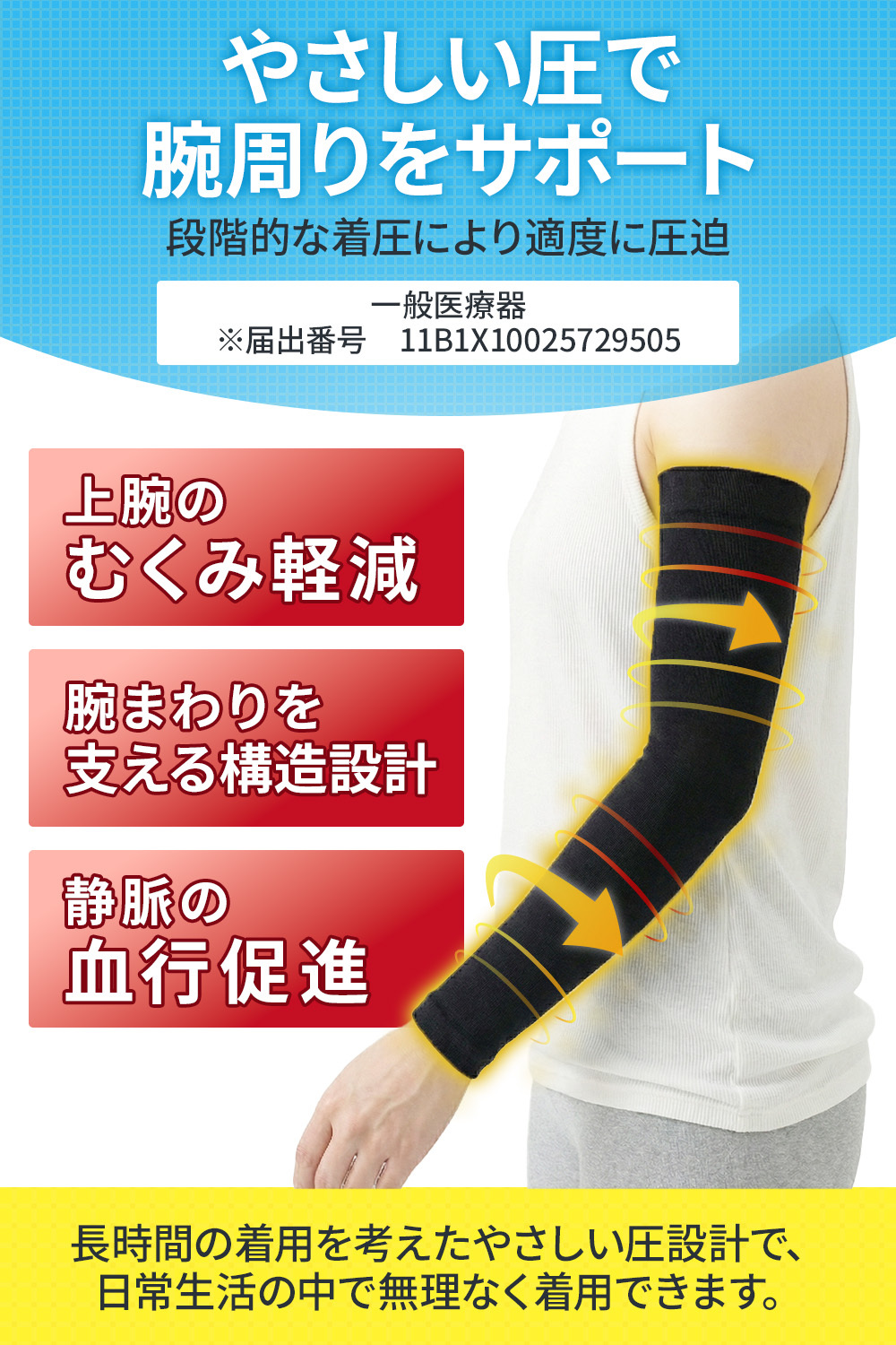 本商品は、上肢の静脈血およびリンパ液のうっ滞を軽減または予防し、静脈還流の促進を目的として使用する二の腕用の弾性スリーブです。