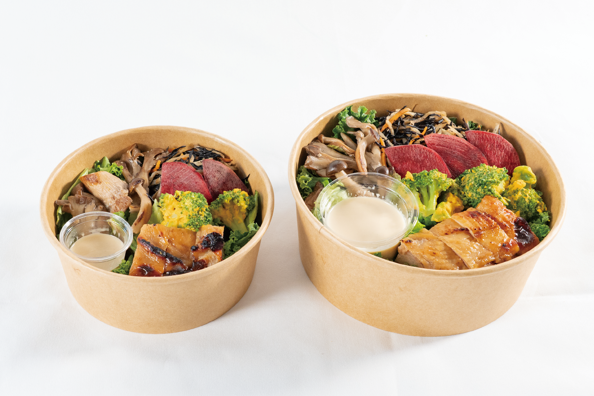 ヨーグルトを使用した特製タレに漬け込んだ照り焼きチキンをメインに、塩麹とりんご酢で仕上げた3種のきのこのマリネ、ひじきを入れた塩きんぴら、ブロッコリーとかぼちゃのサラダの3種のデリがトッピングされた1ボウル。満足感と栄養バランスの取れた美味しさが楽しめる、贅沢な和風サラダです。