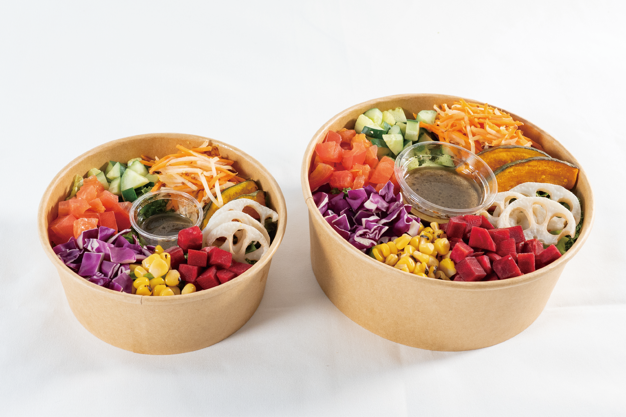 GONNA DAYSのオリジナルサラダは、“西洋野菜をもっと身近に感じて健康になってもらいたい”という想いで開発を行いました。高栄養価で抗酸化作用のある彩り豊かな国産西洋野菜の他、1ボウルで栄養をしっかり摂取できるよう、野菜、魚、肉、穀物などの食材をそれぞれバランス良く配合。またドレッシングを改良した事で、より食べやすく美味しいサラダへと進化いたしました。