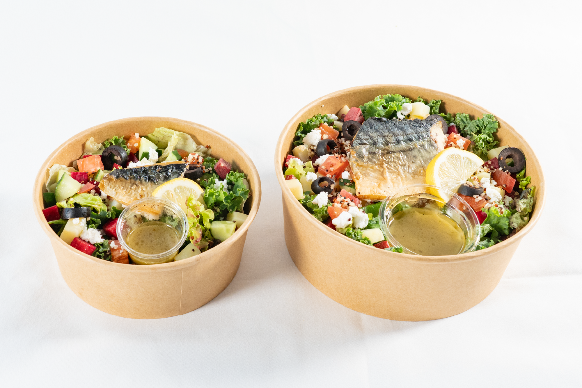 オメガ3(n-3)系脂肪酸が豊富なサバのハーブマリネを主役に、トマト、オリーブ、カッテージチーズを使用した爽やかな色合いの一品。レモンの酸味とハーブの香りが広がる自家製シトラスビネガーの爽やかなドレッシングで、さっぱりと地中海風に。