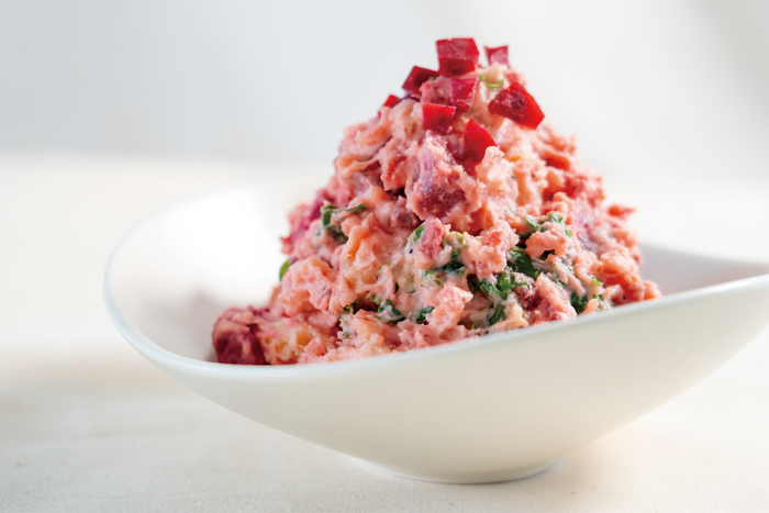 着色料を使用していないビーツ本来の鮮やかなピンクが映える、彩り豊かなポテトサラダ。