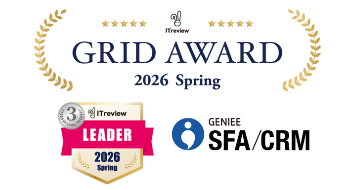 株式会社ジーニー(本社:東京都新宿区、代表取締役社長:工藤 智昭、以下ジーニー)が開発・提供する営業管理ツール「GENIEE SFA/CRM」が、アイティクラウド株式会社が運営するIT製品レビュープラットフォーム「ITreview」において、満足度、認知度ともに優れた製品であると評価され、「ITreview Grid Award 2026 Spring」のSFAツール(営業支援システム)部門で最高位の「Leader」に3年連続で認定されました。