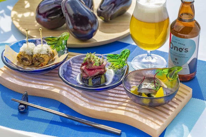大阪のブルワリーで造られたクラフトビールから、個性豊かなビールを5種類用意しました。それぞれ香りや味わい、色が異なるビールを、その日の気分や好みに合わせて、選ぶことができます。また、ビールのお供として提供する「水なすのピンチョスプレート」の3種類の料理とも、相性が抜群。ビールと水なす料理を一緒に味わうことで、それぞれがもたらす香りや味の相乗効果を楽しめます。