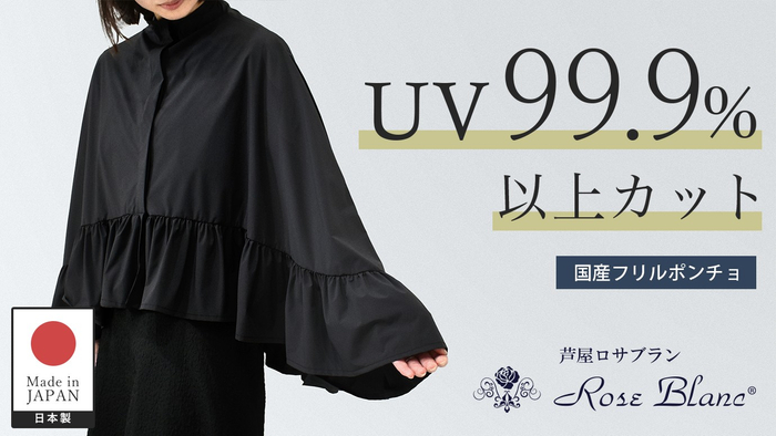 Makuakeに新登場!! 日傘が差せないシーンに「業界最高レベルの99.9%紫外線カットを実現」芦屋ロサブランの「UVカットフリルポンチョ」