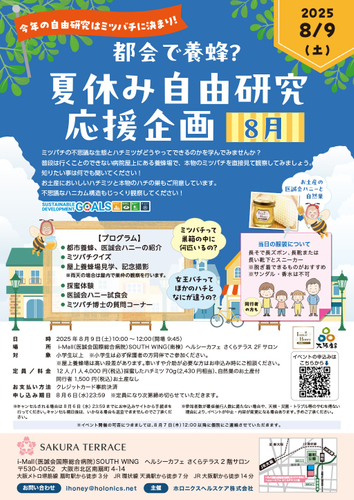 医療法人医誠会(本社:大阪府大阪市、代表者:谷幸治)が運営する医誠会国際総合病院併設のヘルシーカフェさくらテラスは、2025年8月9日(土)に夏休み自由研究応援企画「都会で養蜂?夏休み自由研究応援企画 8月」を開催します。